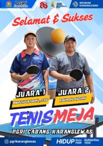 Derap.id | Purwokerto – Kebanggaan membuncah di Kecamatan Karanglewas, Dua sosok tenaga pendidik dari MI Ma’arif NU 01 Pangebatan dan tenaga kependidikan dari SMP Negeri 2 Karanglewas di desa Pangebatan, yang juga alumni MI Ma’arif NU 01 Pangebatan, Awaludin Jamil (‘1996) dan Rahman Ardian(‘1994), sukses besar dengan menyabet Juara 1 dan Juara 2 pada kejuaraan Tenis Meja yang diadakan PGRI Cabang Karanglewas. Rabu (12/11/2025).