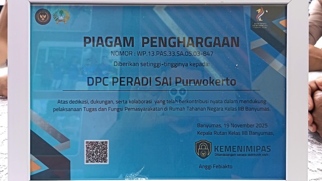 Dalam kegiatan di Bapas kelas II Purwokerto dan Lapas kelas IIB Banyumas tersebut, Peradi SAI menerima penghargaan sebagai Kelompok Masyarakat (Pokmas) yang selama ini peduli dalam pembinaan terhadap WBP (Warga Binaan Pemasyarakatan).