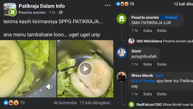 Derap.id | Banyumas – Viral dua video di media sosial tentang menu makanan bergizi di SMA N 1 Patikraja, Kabupaten Banyumas, pada Rabu, 19 November 2025. Diduga siswa yang menerima paket makanan tersebut memvideo menu yang terdapat belatung bergeliat dan merambat pada irisan mentimun, kemudian membagikan video tersebut ke media sosial.